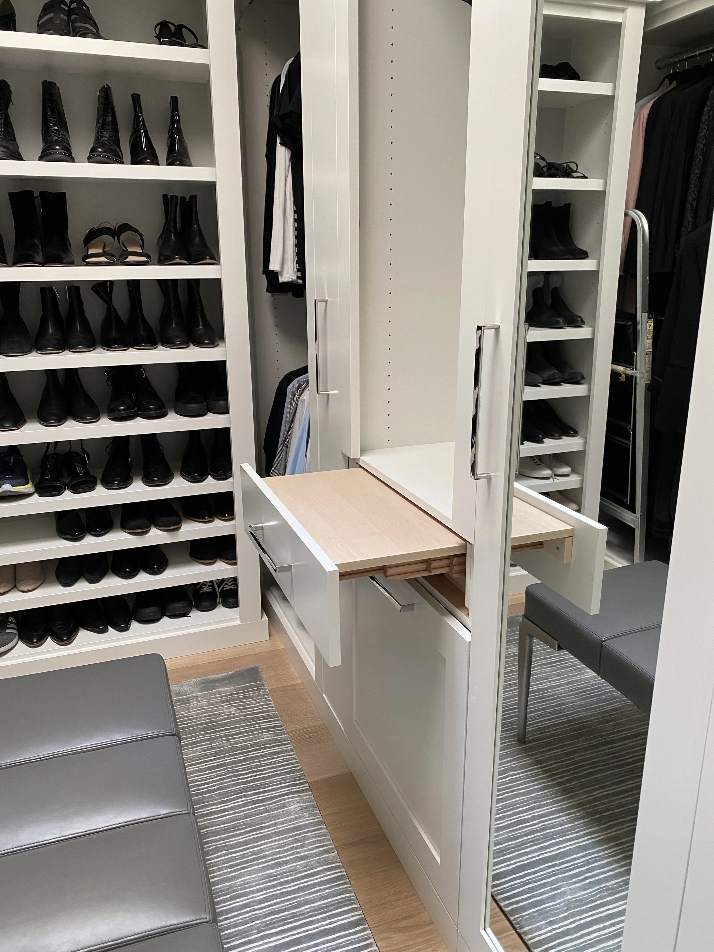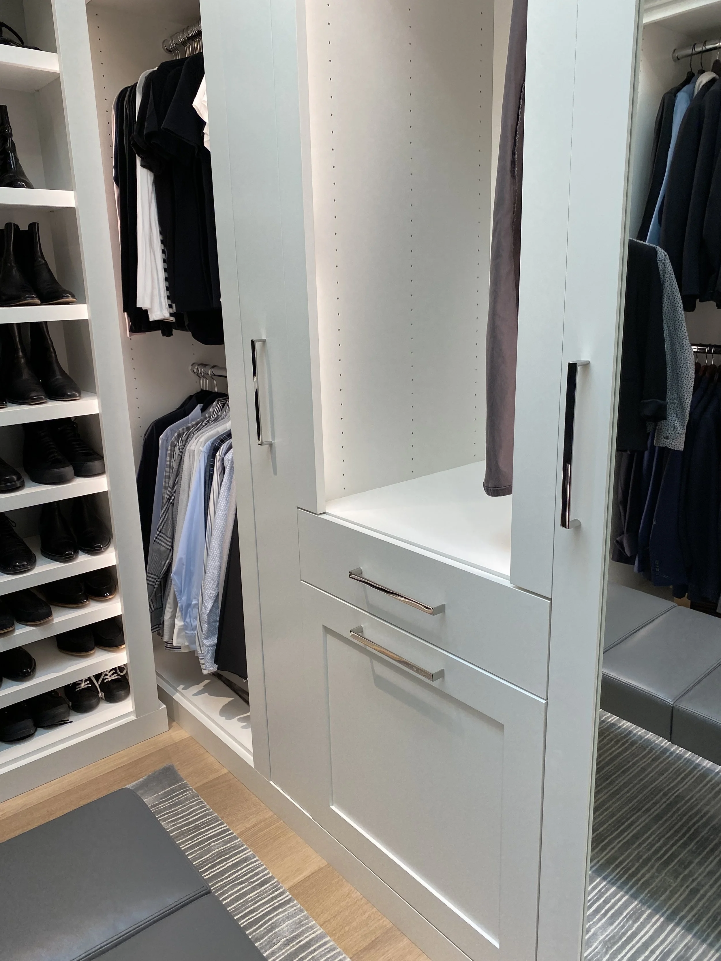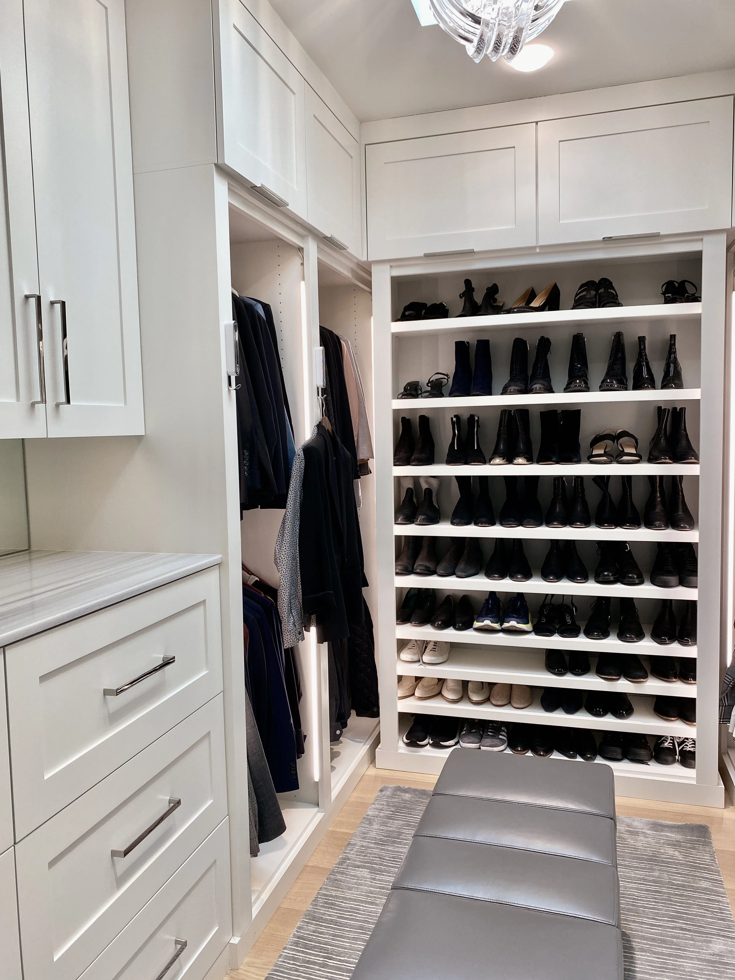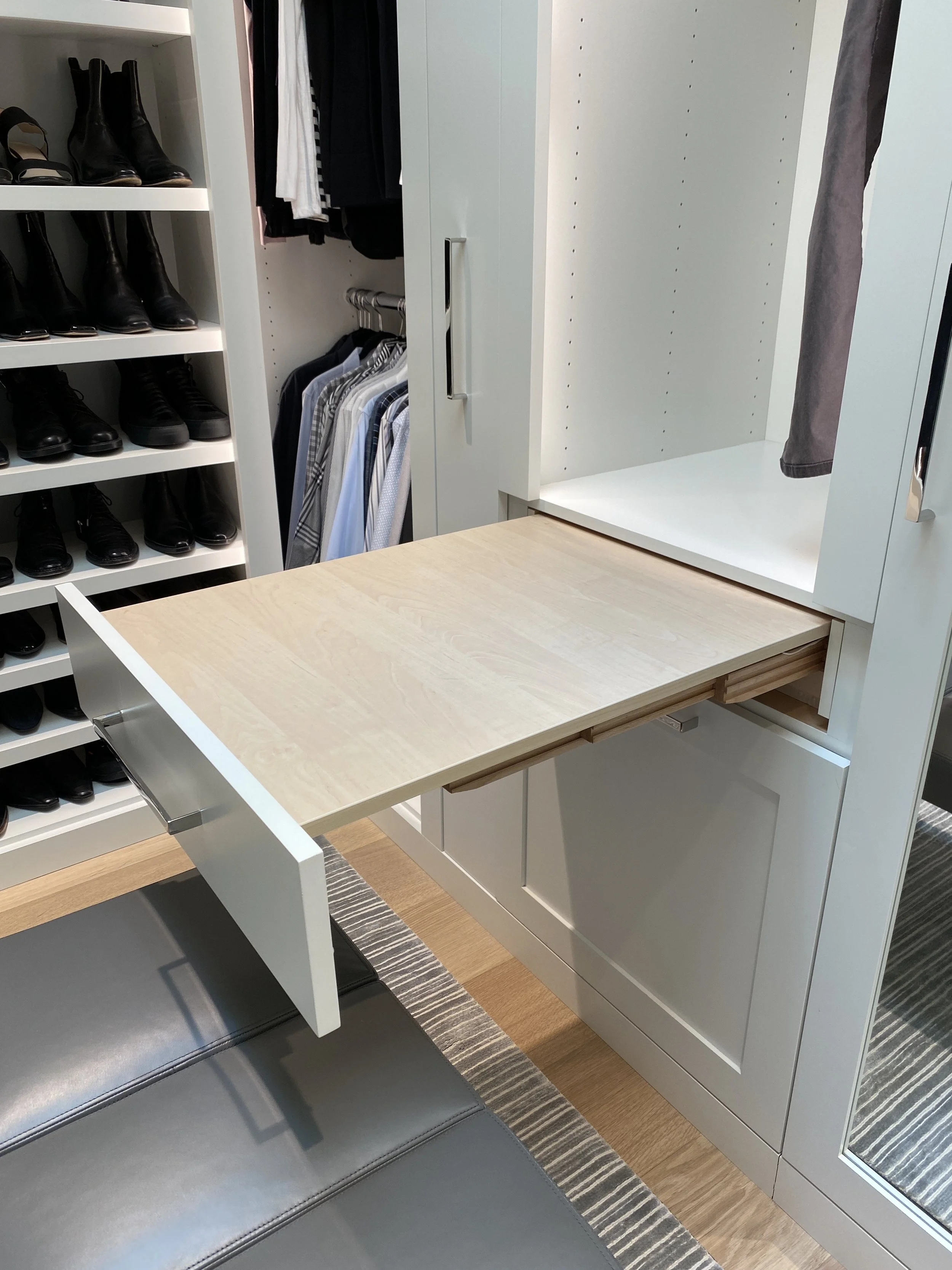 Custom designed and painted closet. Includes a washer and dryer, walnut counter top stained to match the wood flooring, tie and belt drawer, special shoe shelving and plenty of drawers.
