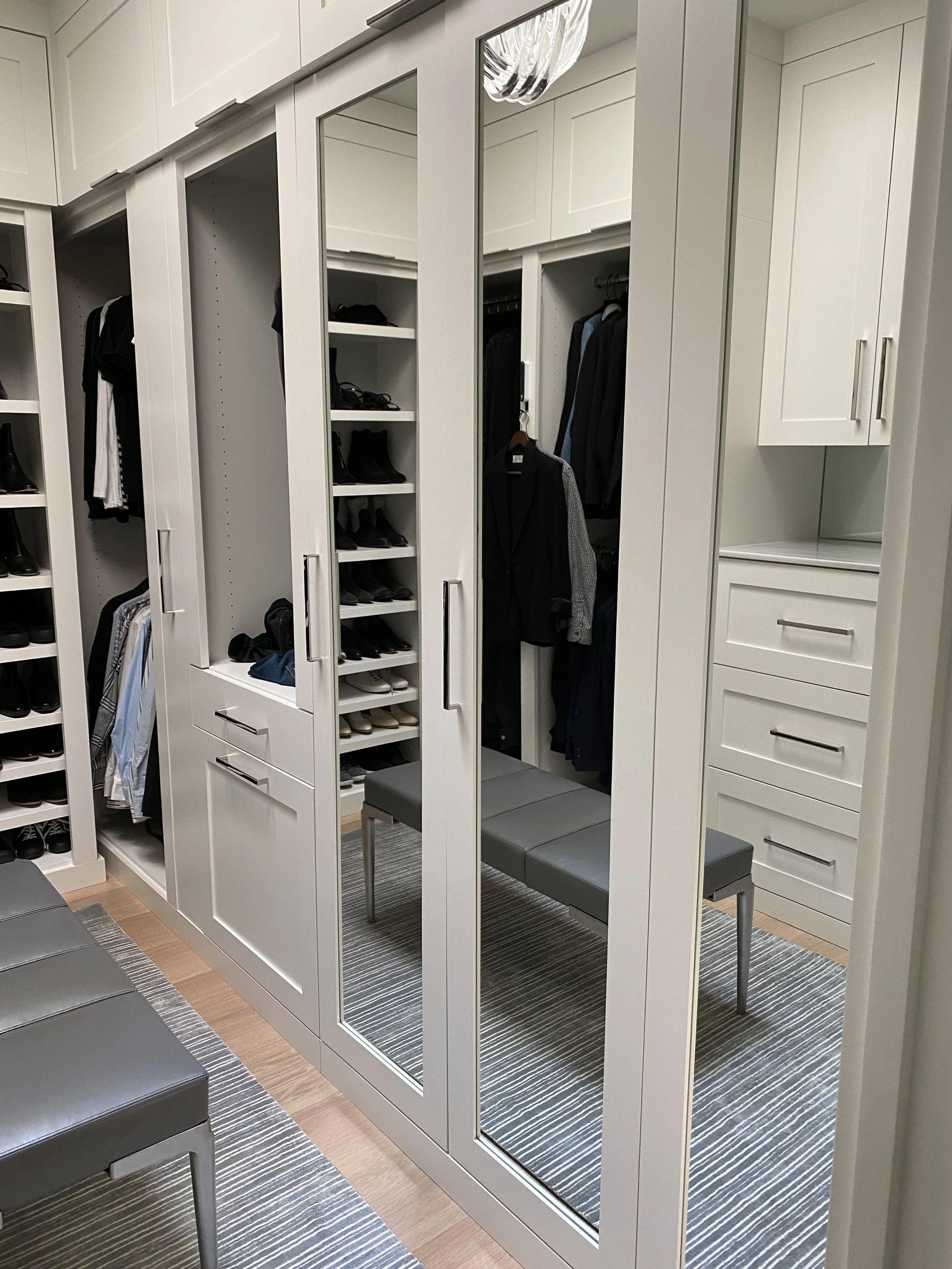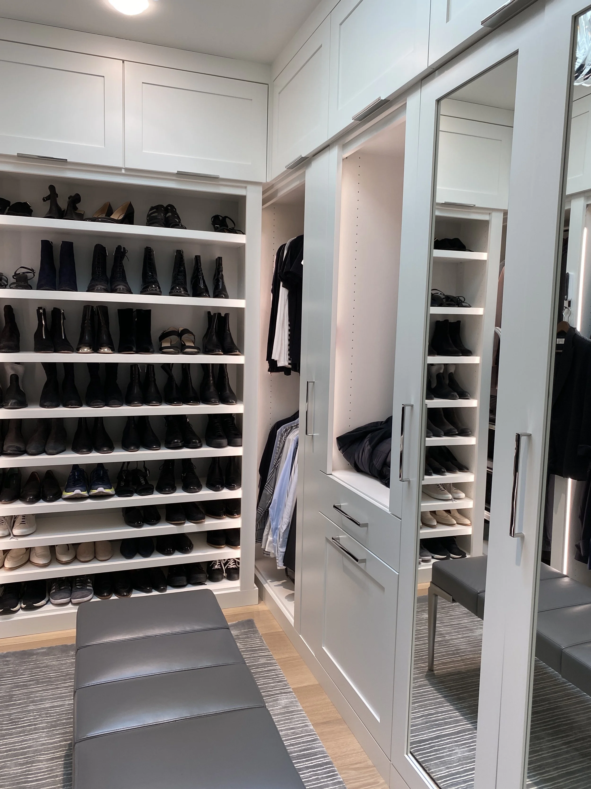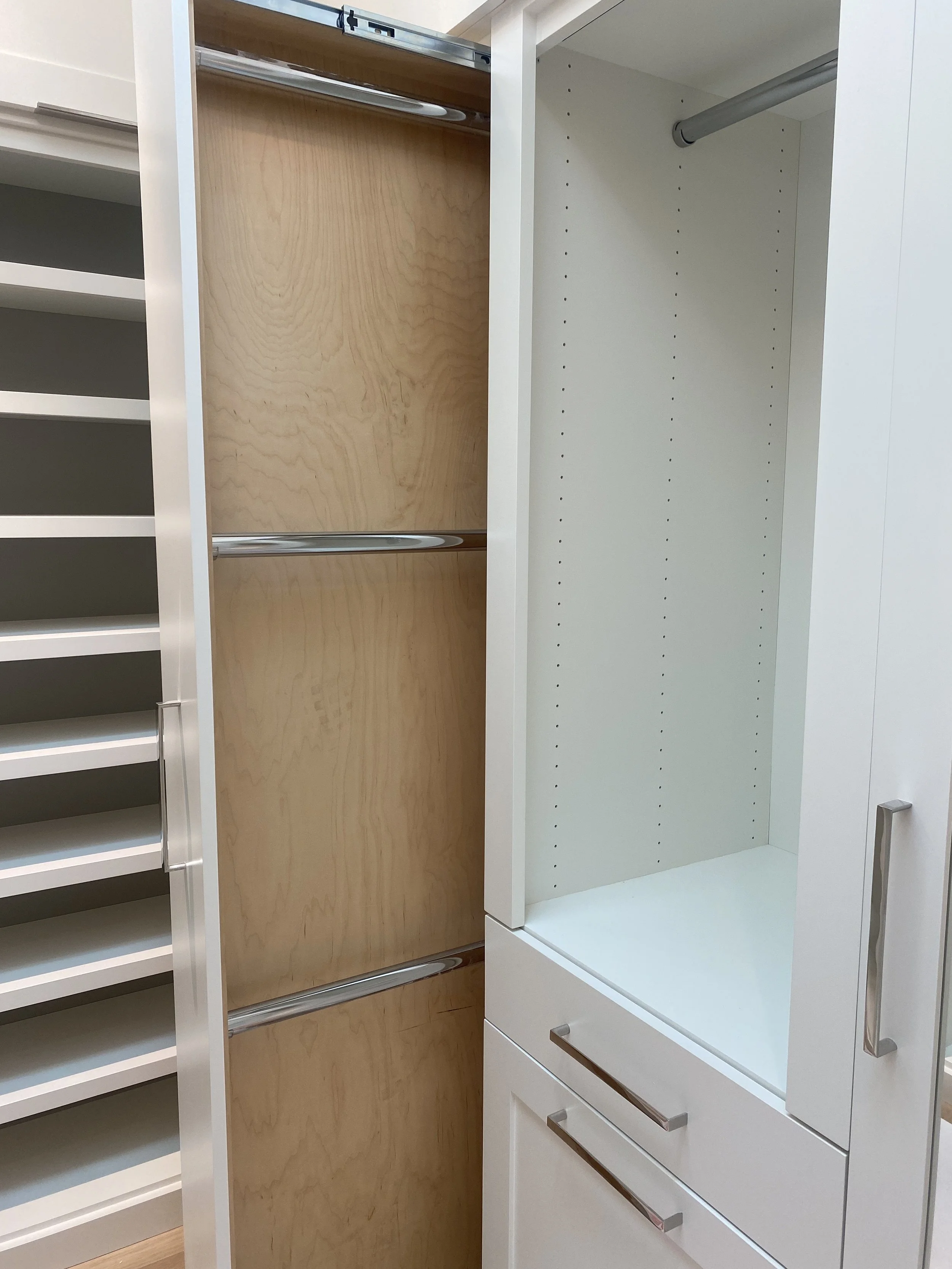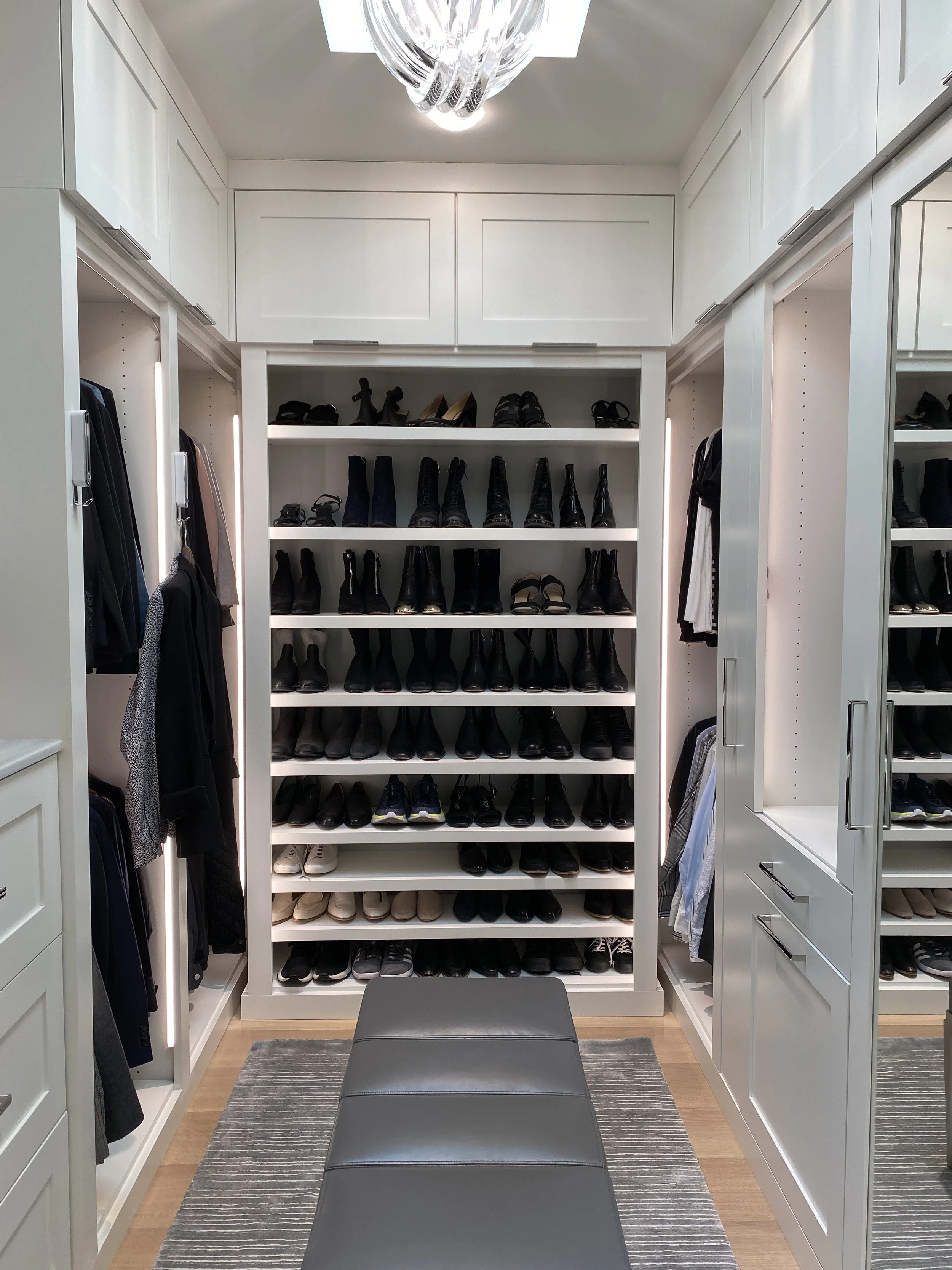 Custom designed and painted closet. Includes a washer and dryer, walnut counter top stained to match the wood flooring, tie and belt drawer, special shoe shelving and plenty of drawers.